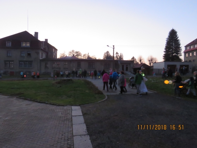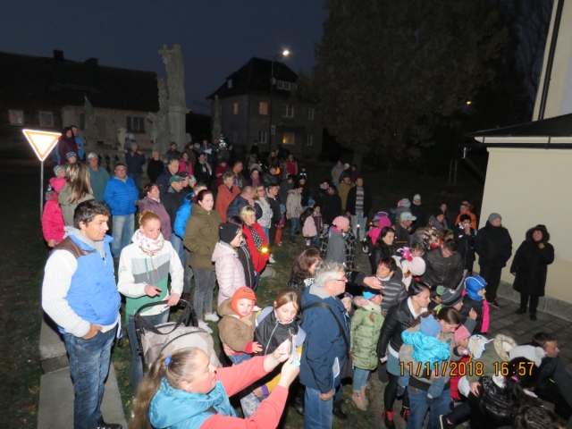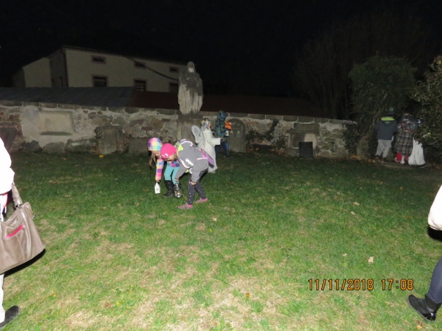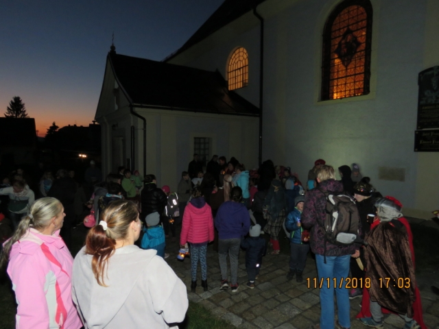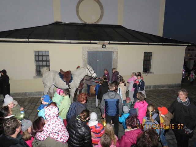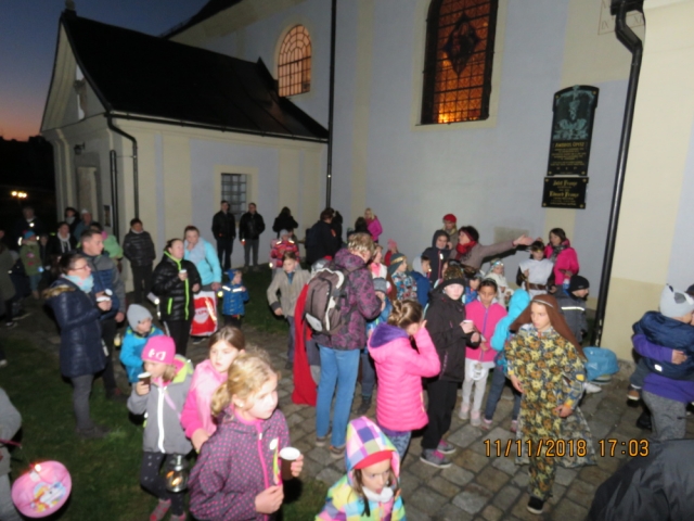 Následně se průvod účastníků přesunul ke kostelu, kde už čekal sv. Martin se svým bílým koněm, aby obdaroval všechny děti. Dále byla ochutnávka svatomartinských rohlíčků (upečené dětmi v sobotu na faře) a teplého čaje. Děti čekala ještě soutěž o hledání dukátů, co pro ně rozházel sv. Martin, a čtyř zlatých podkov, které přitom poztrácel jeho bílý kůň.